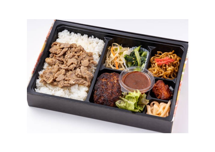 豚カルビとハンバーグが一度に楽しめる贅沢弁当。ご飯が進む甘辛いタレが絡んだカルビと、ふっくらジューシーなハンバーグをご堪能ください。